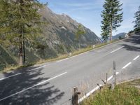 an empty highway with tall evergreen trees and a steep mountain in the background, on a sunny day