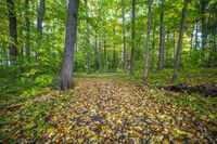 A lush autumn forest with a carpet of colorful leaves covering the grass surface. The straight road offers a unique POV of the breathtaking landscape in this temperate broadleaf and mixed forest.