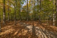 a trail leads into a wooded area with leaves and trees on it, including the shadow of a long path
