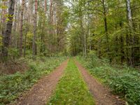 This stock photo captures the beauty of an autumn landscape in Berlin, Germany. It features a pathway leading straight down the road through a lush forest, surrounded by green grass and vibrant plants. The scene is illuminated by natural daylight, with fluffy clouds drifting across the sky above. The dirt road is covered with a layer of gravel and sand, giving it a rustic and natural feel. The image showcases the serene beauty of nature in Europe, with the vibrant colors of the autumn foliage adding to the overall picturesque view.