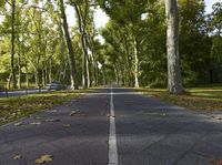 A straight road in Berlin, lined with tall trees and a lush green landscape. The asphalt road surface leads to a suburban residential area. Autumn leaves create a colorful carpet along the thoroughfare.
