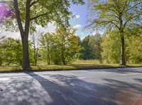 This is an image of a road in Hamburg, Germany. The asphalt road stretches through a picturesque landscape filled with trees. The autumn colors are visible in the leaves, which are illuminated by the sunlight. The image captures the beauty of nature in Germany, highlighting the natural environment and the serene atmosphere. This photo represents a typical day in Hamburg, showcasing the scenic landscapes that can be found in Europe.