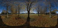 A picturesque autumn landscape with trees and leaves. The grass surface adds to the natural beauty of the scene, while the dead trees provide an interesting contrast. The straight road leads to a recreational park, offering a perfect destination for outdoor activities.