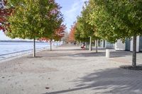 A vibrant autumn sidewalk in Toronto, Ontario, Canada. The road is lined with beautiful trees displaying colorful foliage. People can be seen enjoying the day, sitting at tables along the river. The image captures the charm of this urban neighborhood, where nature seamlessly blends with the cityscape. The woody plants with their falling leaves add to the scenic beauty, creating a perfect atmosphere for a leisurely walk. The clear blue sky with fluffy clouds complements the serene walkway in this public space. This photo showcases the essence of Toronto's recreational spots and its connection to the natural surroundings.