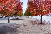 This is an image of a straight road leading toward Toronto, Canada. The road is surrounded by autumn colors as the deciduous trees shed their leaves. The vibrant red leaves contrast with the cloudy sky above. The road surface is visible, along with the vegetation growing alongside it. This photo captures the beauty of nature in Ontario on a typical autumn day. It represents a public space that is often used for recreational activities.
