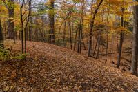 This stock photo showcases an enchanting autumn trail in an Ontario forest. The image captures a peaceful setting with tall trees showcasing their vibrant foliage. Surrounding the trail is a picturesque field, adorned with lush grass and scattered twigs. In the distance, a clear sky complements the natural beauty of the forest. The trail, covered in brown dirt and gravel, creates a serene thoroughfare. This captivating image represents the stunning natural landscapes of Ontario, Canada.