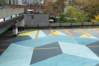 a parking garage has an unusual painted mural on it's surface, outside of a building