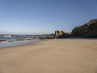 This stunning image captures the natural beauty of Portugal's coastal landscape. The azure waters of the ocean meet the sandy shore, creating a peaceful and serene scene. The clear sky above provides a brilliant backdrop, while the trees and wood add a touch of green to the landscape. The rugged terrain and rocky bedrock give the area a unique character. This photo portrays the open space and beauty of nature, inviting viewers to immerse themselves in the breathtaking scenery of Portugal's coastline.