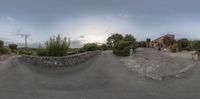 A rural road at dawn in Majorca, Spain. The Balearic Islands' landscape opens up to straight roads leading to farms and homes. Clouds break day over the European countryside.