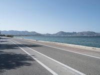 This is an image of a coastal road in Mallorca, Spain. The asphalt road winds through the scenic landscape, with the clear sky reflecting on the calm waters of the ocean. The picture captures the natural beauty of Mallorca, one of the Balearic Islands in Europe. It represents a typical sunny day on the island, where visitors can enjoy the stunning coastal views and immerse themselves in the beauty of nature.