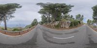 A scenic road in Spain's Balearic Islands, where trees grow over a dirt road while an asphalt road lies underneath. The coastal landscape features stunning views of the ocean and mountainous terrain.