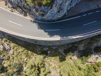 An aerial view of an elevated asphalt road in Mallorca, Balearic Islands. The top-down perspective showcases the stunning landscape of the island. A high vantage point provides a panoramic view of nature in Mallorca.