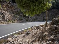 A rocky road in the Balearic Islands of Spain, surrounded by lush vegetation and towering trees. The motorcycle parked on the hill adds a touch of adventure to the scenic landscape.