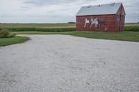 This is an image of a rural road in Bancroft, Iowa, USA. The road surface is a combination of dirt, asphalt, and gravel. The road curves through fields and open spaces, with a grey sky overhead. Along the road, there are farmhouses, barns, sheds, and agricultural structures. The property is surrounded by grass and fields, representing the rural landscape of Iowa. This photo captures the essence of a typical day in the countryside of Iowa, with its peaceful and serene atmosphere.