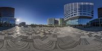 A panoramic view of a large glass and concrete building in Barcelona's business district. The circular picture showcases the modern architecture and futuristic design. The clear blue sky and sunlight enhance the symmetrical structure.