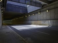 This photo captures the architecture of Barcelona, Spain. The image shows a low-rise concrete building with a glass facade, surrounded by a spacious parking lot. The orange light on the wall creates a warm glow, illuminating the empty lot. In the foreground, street lights create a symmetrical pattern, leading the eye towards the entrance of the building. This metropolitan area is characterized by its modern and sleek design, blending seamlessly with the surrounding urban landscape. The photo represents a typical day in Barcelona, with artificial lights adding charm and ambiance to the bustling city streets.