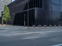 A city street scene in Barcelona, Spain on a sunny day. Modern architecture and office buildings cast long, hard shadows on the asphalt road. The clear sky adds to the vibrant atmosphere of this European city.