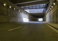 A paved road in Barcelona, Spain passes under a bridge illuminated with artificial lights. The symmetrical tunnel creates a low-ceilinged effect. Tints and shades of light create a captivating scene in the heart of the city.