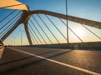 The Prat bridge in Barcelona at dawn, with clear skies and a low sun visible. The road, asphalt, and bridge create a picturesque view of sunny Spain. A perfect Europe daybreak.