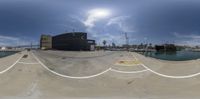 A modern concrete street in Barcelona with a clear sky and ocean backdrop. The city’s urban design includes a coastal pier and landing. The open space of a parking lot provides a glimpse into Barcelona's city life.