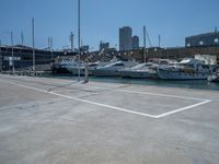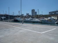 A modern architectural jetty in Barcelona, Spain, extending into the clear sky above the coastal harbor. The concrete surface reflects the urban skyline, while the ocean laps against the landing. An epitome of modern architecture on the European coast.