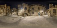 A panoramic view of Barcelona's old town at night. The image showcases the city's historic architecture, with a large brick building dominating the scene. The street is lined with cobblestones and illuminated by street lights, creating a symmetrical and atmospheric atmosphere.