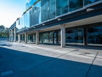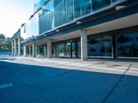 This image captures the urban vibe of Barcelona, Spain. The city's modern architecture and futuristic design are showcased in this photo, with a clear sky as the backdrop. The empty street leads to a sleek office building with glass windows and a distinctive metal frame on top. The low and hard shadow adds depth and contrast to the scene. This photo represents the bustling city life and business district of Barcelona, where shopping and urban design come together. It is a perfect representation of the modernity and innovation of Spain's urban landscape.