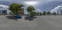A modern office building in the business district of Barcelona, Spain. The city skyline showcases the urban design and architecture of Europe. Shadows from the tall buildings create interesting visuals on the asphalt road.