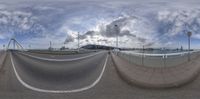 A straight road leads towards a modern bridge in Barcelona, Spain. Coastal skyline and harbor pier visible, with clouds above. The urban landscape reflects the mix of modern and traditional architecture that defines Europe.