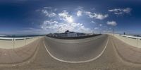 A straight road in Barcelona leading to a modern bridge, with the coastline and ocean in the background. The urban architecture stands out against the clear blue sky, creating a stunning European coastal scene.
