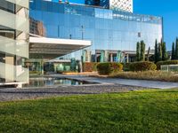 This is an image of a modern office building in Barcelona, Spain. The building stands tall against a clear sky, with its large glass windows reflecting the urban architecture surrounding it. The grass surface and trees surrounding the building create a lush and green environment. This photo represents the bustling business district of Barcelona, with its modern architecture and urban design. It showcases the city's vibrant atmosphere and European charm.