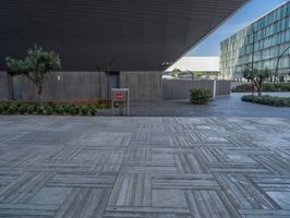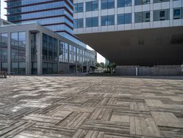 A straight down shot of the urban landscape in Barcelona, Spain. The modern architecture of office buildings and business districts creates a striking profile against the clear European sky. Open spaces and pavers add to the urban design.