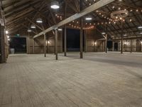 A dark and rustic barn interior in rural California. The wooden floor and concrete surfaces create an interesting contrast. The room is illuminated by artificial light, highlighting the architectural details of the building. Clear sky seen through the hall windows.