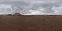 A long view of the barren desert landscape in California, USA. The road stretches straight through the open space, surrounded by mountains and hills. Clouds create a dramatic sky above the sandy terrain.