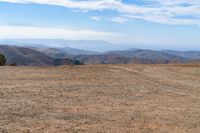 a man stands in a barren valley in the distance are mountains and trees in the distance