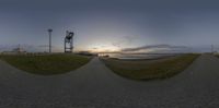 a fish eye view of a beach at dusk with the sun going down in the distance