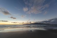 A serene coastal landscape at dawn. The horizon blends with the surface of the ocean, creating a fluid atmosphere. The beach is a peaceful place for recreational activities, with soft sand and clear water.