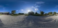 A beautiful beach house in Los Angeles, California, surrounded by lush vegetation and a clear sky. The fisheye lens captures the unique architecture and the straight road leading to the house. A perfect day in the sunny state of California.