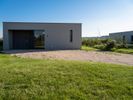 A modern residential villa in Holland, with a panoramic view of the beach. The house is made from concrete and has a bright sun shining on it. The clear sky and open space create a serene atmosphere.