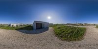 a panoramic image of an outside house made from sand on the beach with bright sun