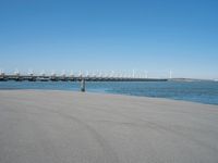 A calm day on the coastline of Holland, with a pier extending into the ocean. A windmill stands in the background, capturing the essence of the Netherlands. The open space and clear sky provide a serene landscape.