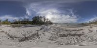 A coastal landscape with a sandy beach and lush vegetation. Trees line both sides of the beach, creating a serene and natural open space. The clear blue ocean waves gently caress the shore, reflecting the sunlight. A perfect day to enjoy the beauty of nature.