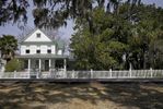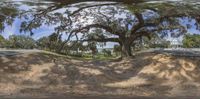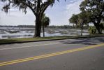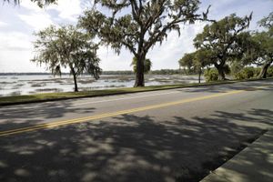 A scenic view of a road in Beaufort, South Carolina, surrounded by lush vegetation and a big tree with lots of branches. The road leads to a park by the water, providing a peaceful and nature-filled residential area.