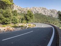 A scenic road in Mallorca, Spain winding through the breathtaking mountain landscape of the Balearic Islands. The smooth asphalt surface and clear skies make for a perfect day of driving.