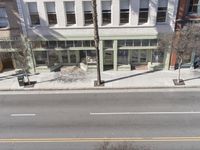 This stock photo captures a picturesque street corner in the city. The image showcases a very pretty store front with its windows opened, revealing the vibrant inner display. Two cars are parked beside the building, adding to the busy urban atmosphere. The architecture of the building and the surrounding houses reflects the charm of the residential neighborhood. The image was taken during the day, with a high profile snow covering the road and curbs, creating a winter wonderland in the downtown area. The asphalt road surface and the facades of the buildings add to the urban feel of the scene.