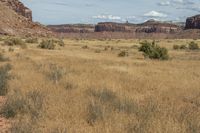 A horse with a saddle stands on the open grassy plains of Beef Basin, Utah. The backdrop of red rocks and canyons showcases the rugged beauty of the desert landscape.