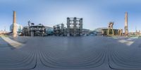 the view from a 360 - view lens to a wide plaza and factories in the background