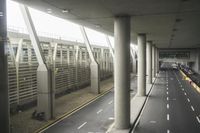 the view of the airport from an above floor area looking into a long walkway next to a parked cars and buildings