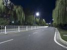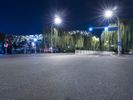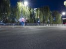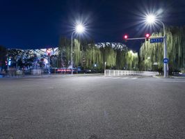 Night shot of an empty road intersection in Beijing, China. Wide lanes and futuristic architecture create a spacious and modern urban landscape. Pedestrians and cars share the road under a clear sky.