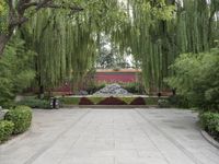 A view of a straight road lined with green grass and trees in Beijing, China. Clear sky contrasts with the urban landscape. The botanical garden provides a serene oasis in the bustling city.